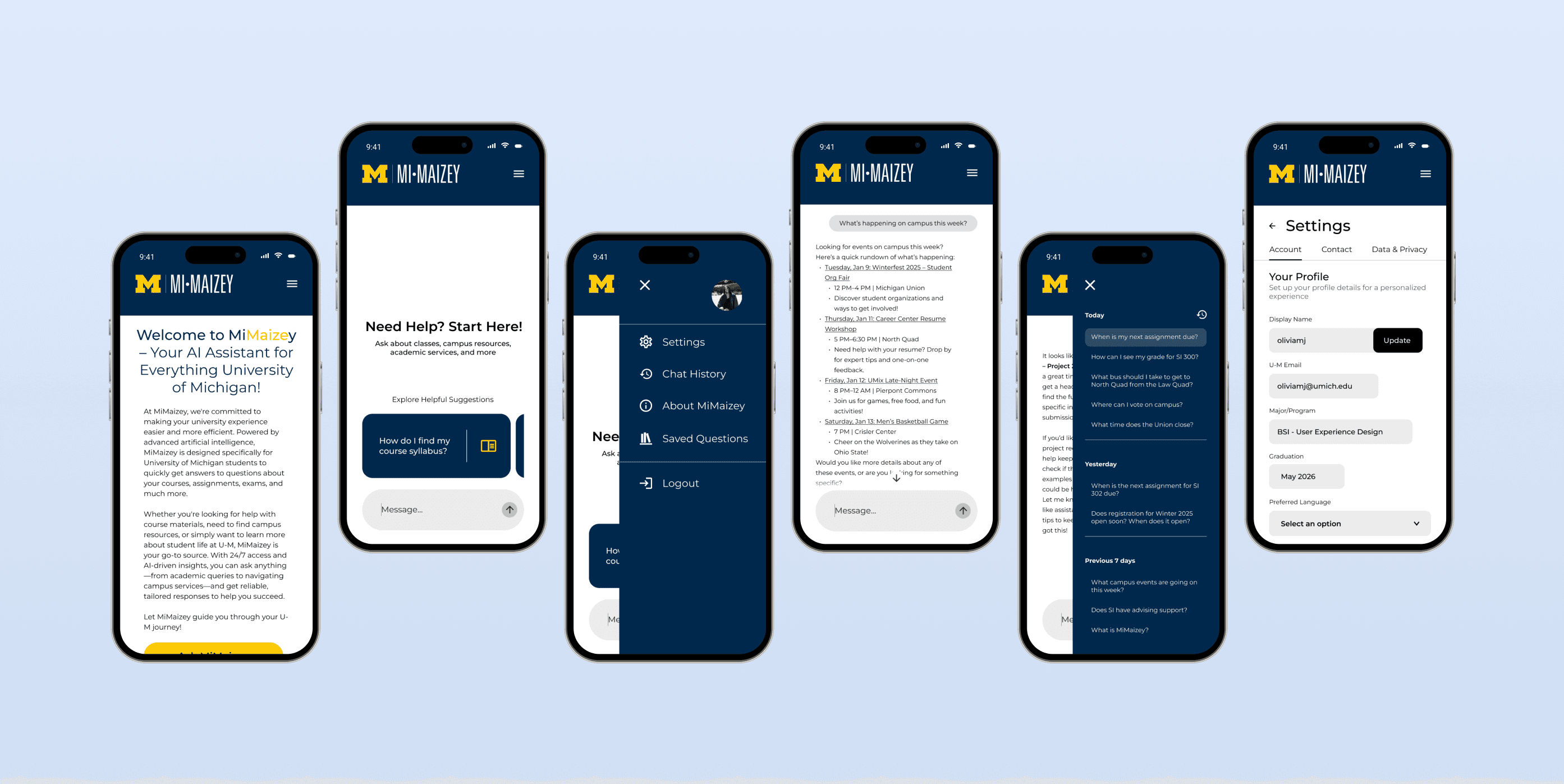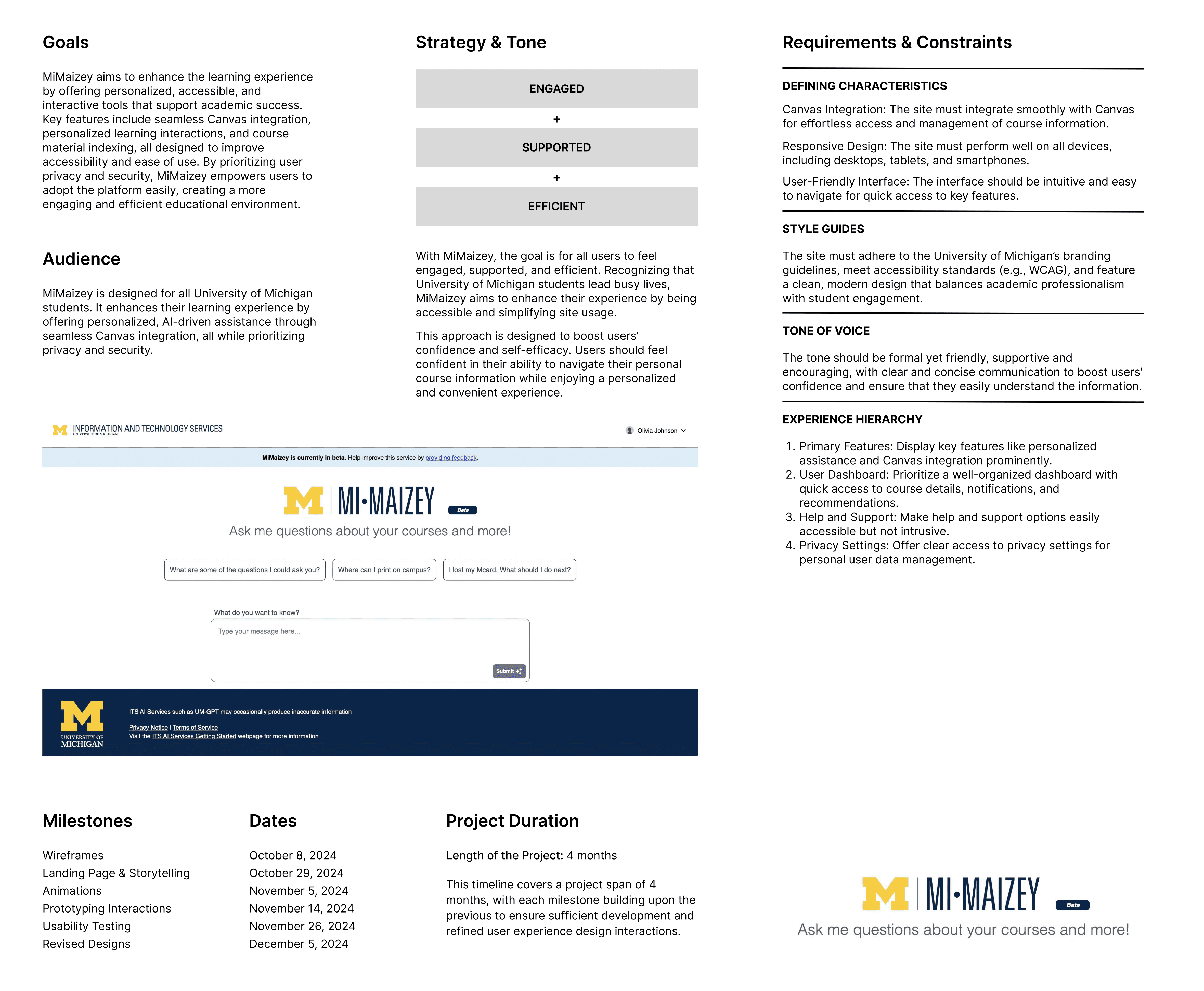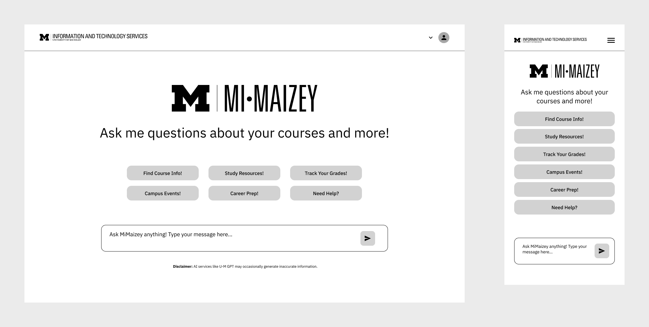 MiMaizey, part of the University of Michigan’s ITS AI services, is an AI-powered chatbot designed to enhance the student experience. Developed as a project for SI 307 - Introduction to User Experience Design, it seamlessly integrates into Canvas to offer personalized support. MiMaizey helps students navigate academic resources, find answers to common questions, and access campus services, all while ensuring privacy and security.
