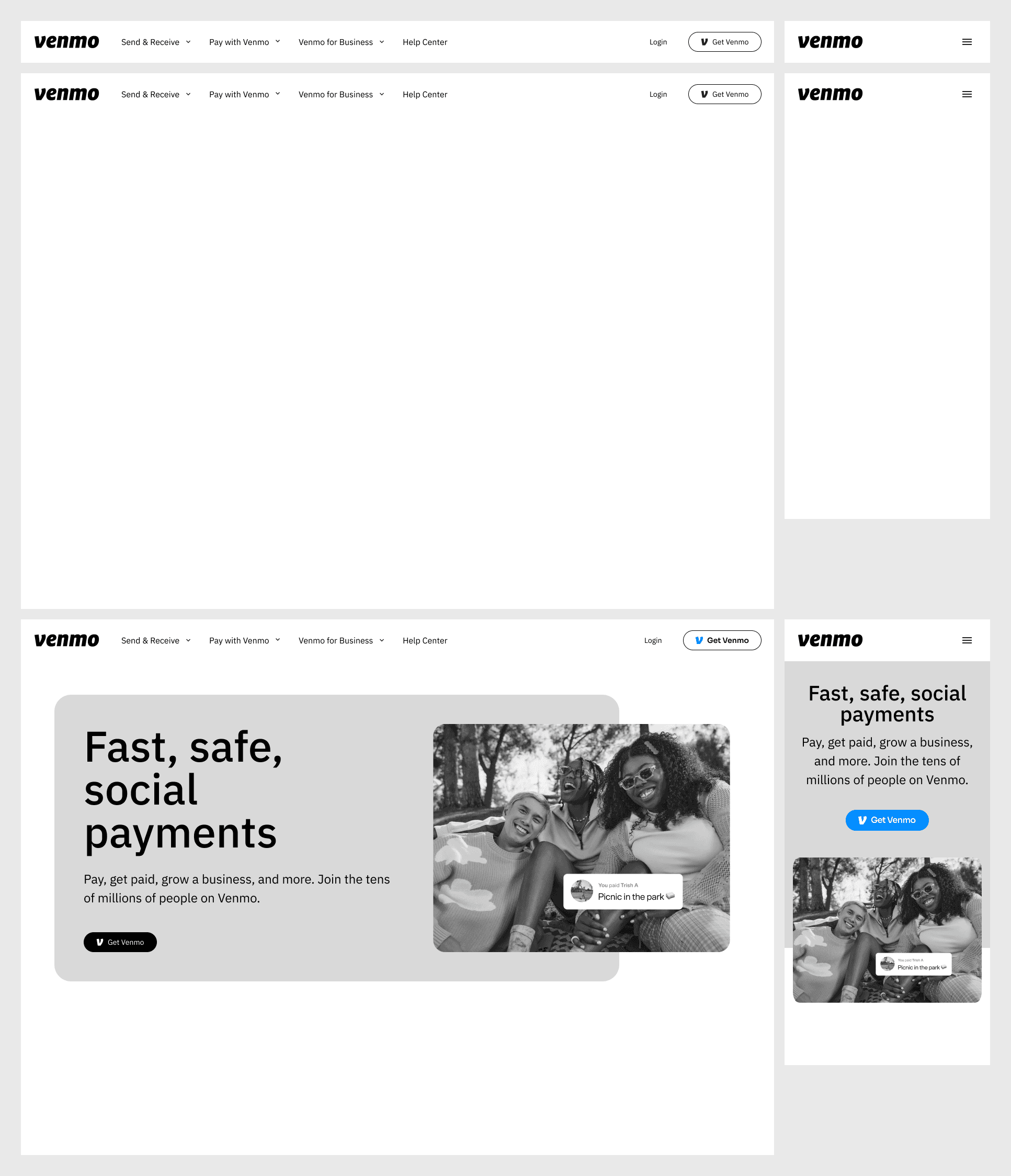 Explore the desktop and mobile design layouts for the Venmo homepage redesign.